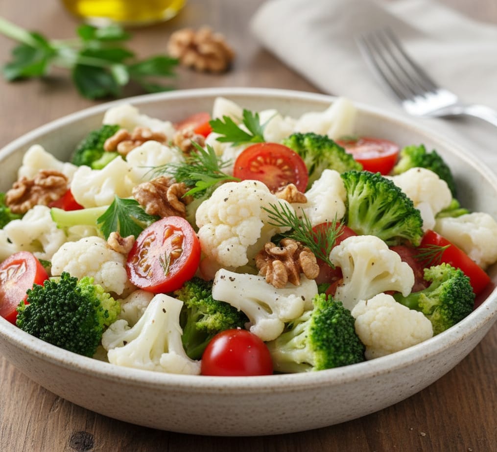 סלט זה מכיל קומפלקס של רכיבים נוגדי סרטן. עגבניות השרי והברוקולי נמצאים יחד בסינרגיה ומעצימים זה את תכונותיו של האחר. הכרובית והברוקולי בני משפחת המצליבים נוגדת הסרטן הידועה ואגוזי המלך שמכילים אומגה 3, מתחברים יחד לסלט בריאותי מאין כמוהו. העדיפו ירקות אורגניים ואם אין באפשרותכם- עדיין כדאי לצרוך את המצליבים הללו בכל מקרה.